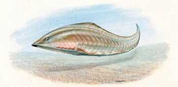 | | This tiny fish (a little over an inch long, or 3 cm) is Haikouichthys. Its fossils have been found in the Lower Cambrian, where the first complex creatures suddenly appear in the fossil record. This "first fish" has a spine and spinal cord, eyes, gills, fins, scales, mouth, etc., though no jaw, like a lamprey. About 500 were found buried together.32 |